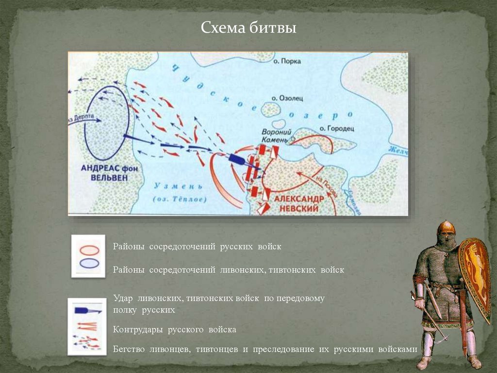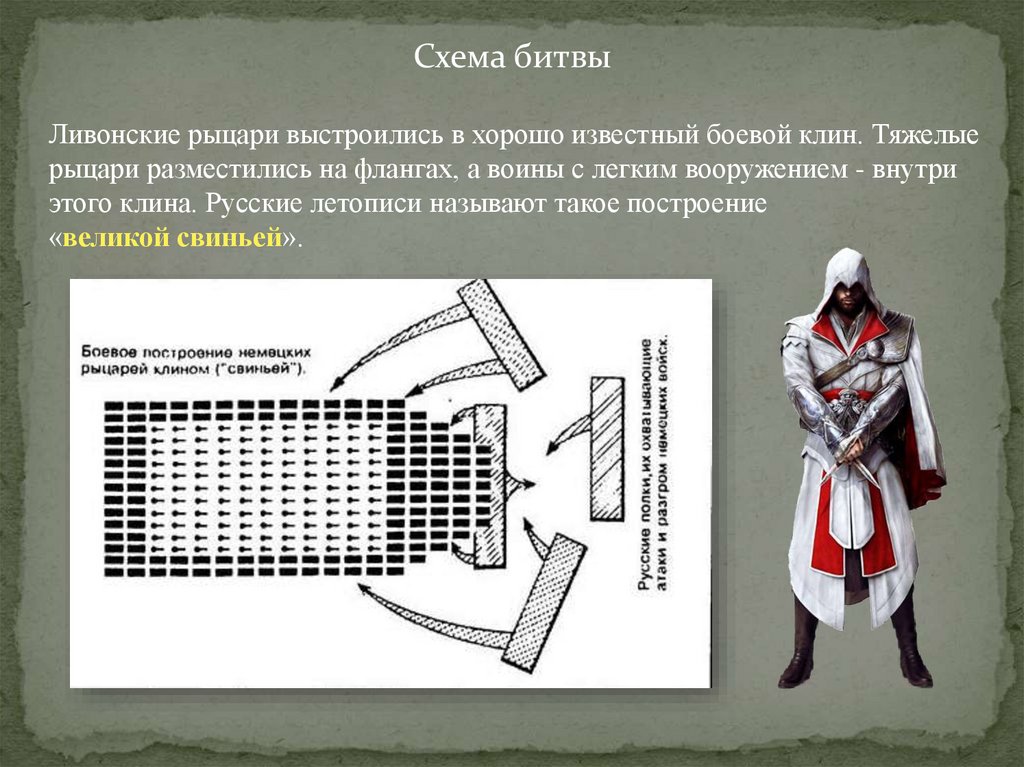 Схема битвыЛивонские рыцари выстроились в хорошо известный боевой клин. Тяжелые