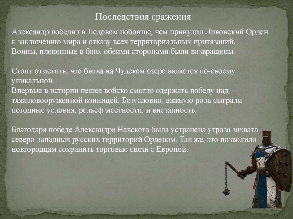Последствия сраженияАлександр победил в Ледовом побоище, чем принудил Ливонский Орден
