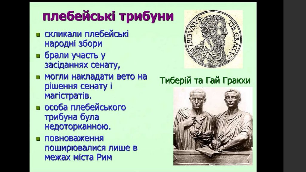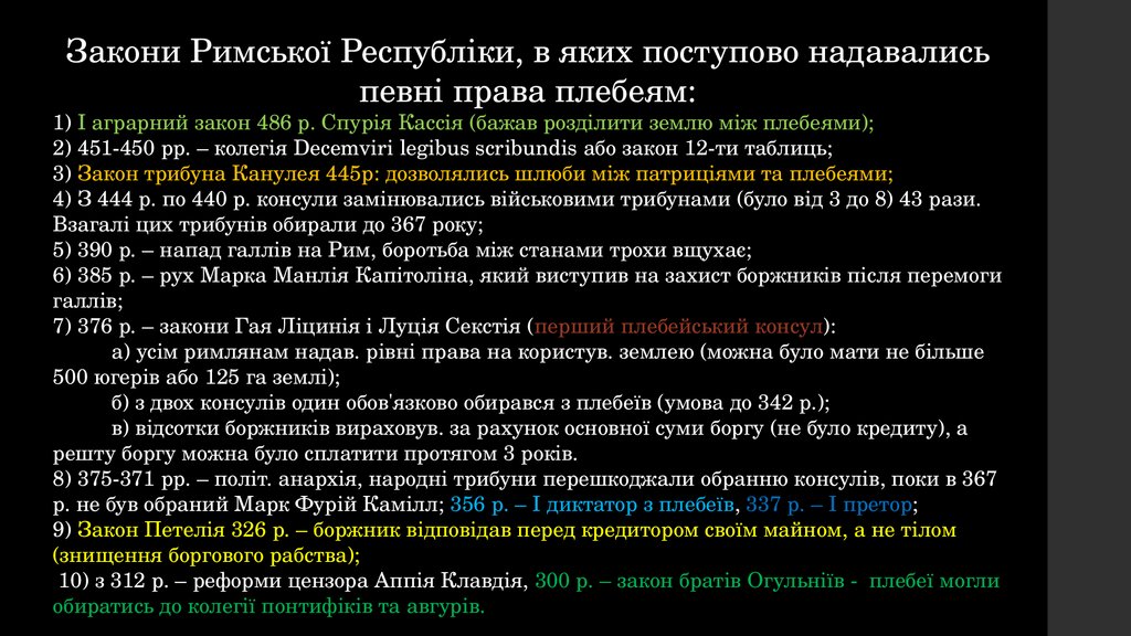 10) з 312 р. – реформи цензора Аппія Клавдія, 300 р. – закон братів Огульніїв - плебеї могли