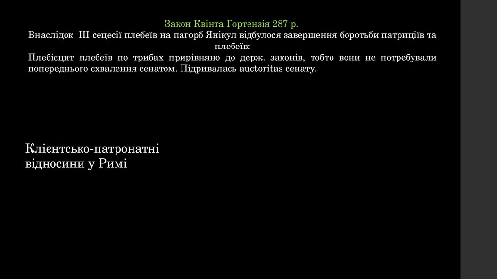 Закон Квінта Гортензія 287 р.Внаслідок ІІІ сецесії плебеїв на пагорб Янікул відбулося завершення боротьби патриціїв та
