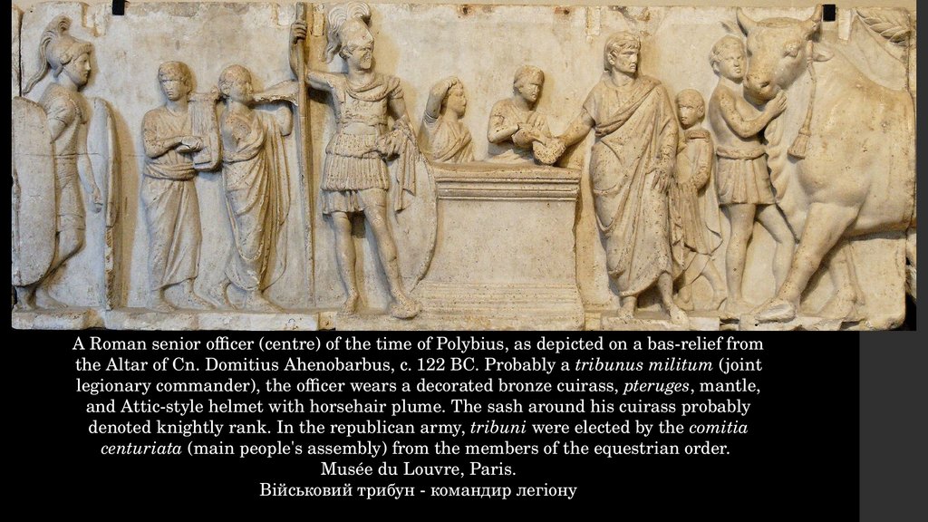 A Roman senior officer (centre) of the time of Polybius, as depicted on a bas-relief fromthe Altar of Cn. Domitius Ahenobarbus, c. 122 BC. Probably a tribunus militum (joint