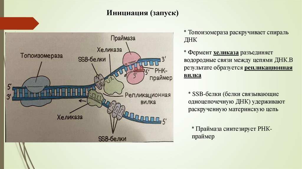 Инициация (запуск)* Топоизомераза раскручивает спираль