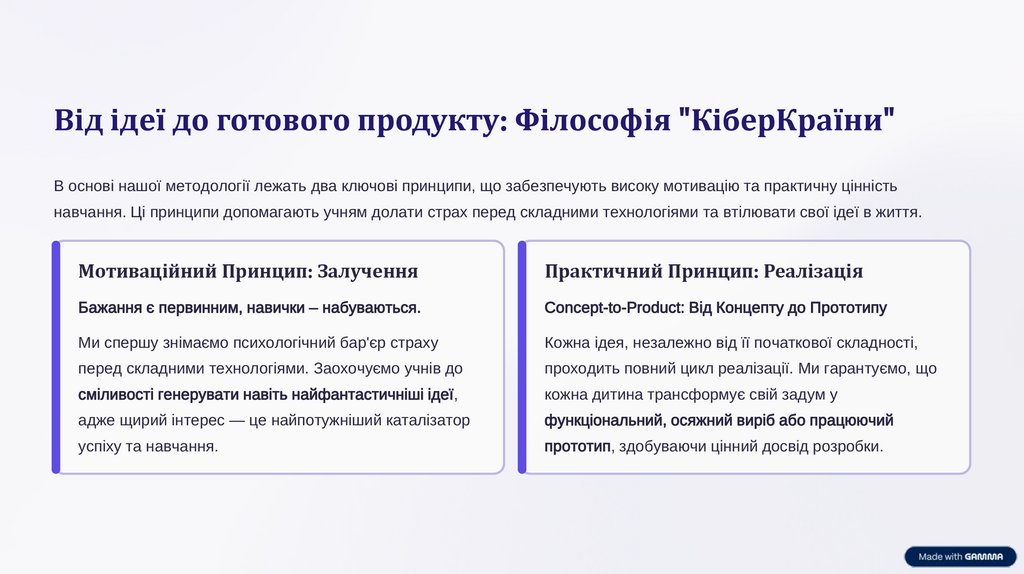 Від ідеї до готового продукту: Філософія "КіберКраїни"В основі нашої методології лежать два ключові принципи, що забезпечують високу мотивацію та практичну цінність