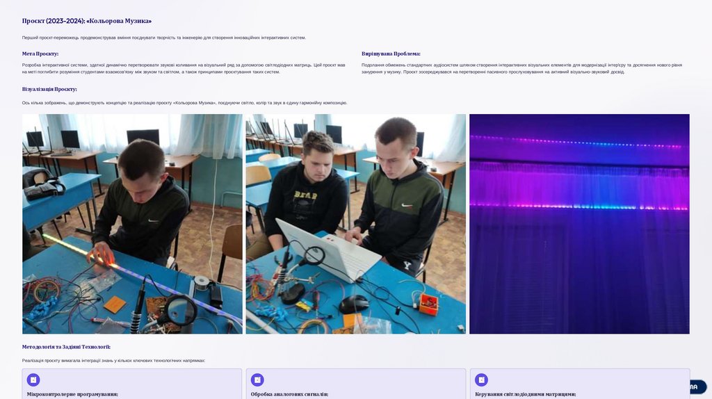 Проєкт (2023-2024): «Кольорова Музика»Перший проєкт-переможець продемонстрував вміння поєднувати творчість та інженерію для створення інноваційних інтерактивних систем.