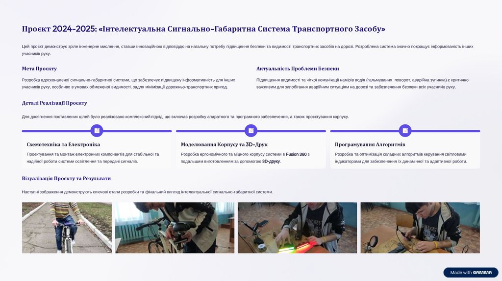 Проєкт 2024-2025: «Інтелектуальна Сигнально-Габаритна Система Транспортного Засобу»Цей проєкт демонструє зріле інженерне мислення, ставши інноваційною відповіддю на нагальну потребу підвищення безпеки та видимості транспортних засобів на дорозі. Розроблена система значно покращує інформованість інших
