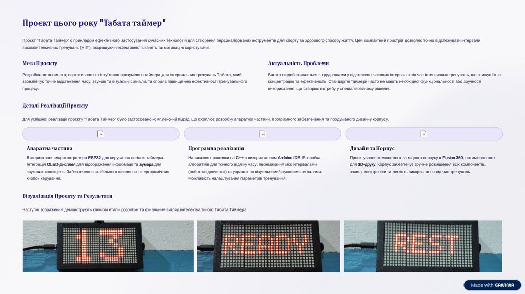 Проєкт цього року "Табата таймер"Проєкт "Табата Таймер" є прикладом ефективного застосування сучасних технологій для створення персоналізованих інструментів для спорту та здорового способу життя. Цей компактний пристрій дозволяє точно відстежувати інтервали