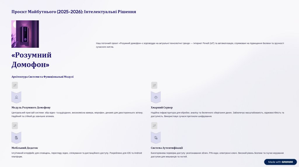 Проєкт Майбутнього (2025-2026): Інтелектуальні РішенняНаш поточний проєкт «Розумний домофон» є відповіддю на актуальні технологічні тренди — Інтернет Речей (IoT) та автоматизацію, спрямовані на підвищення безпеки та зручності