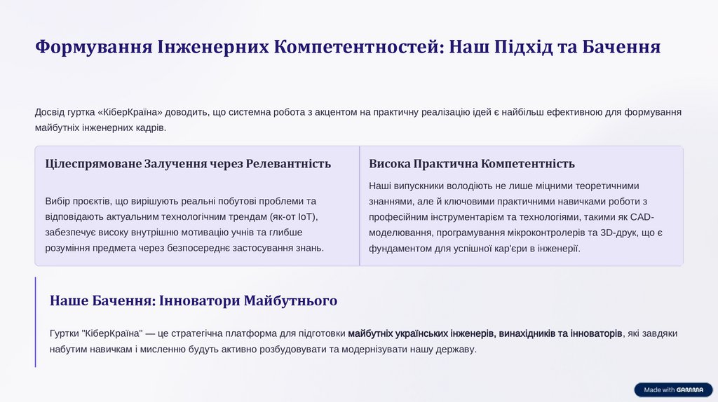 Формування Інженерних Компетентностей: Наш Підхід та БаченняДосвід гуртка «КіберКраїна» доводить, що системна робота з акцентом на практичну реалізацію ідей є найбільш ефективною для формування