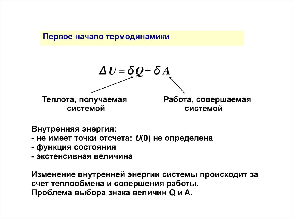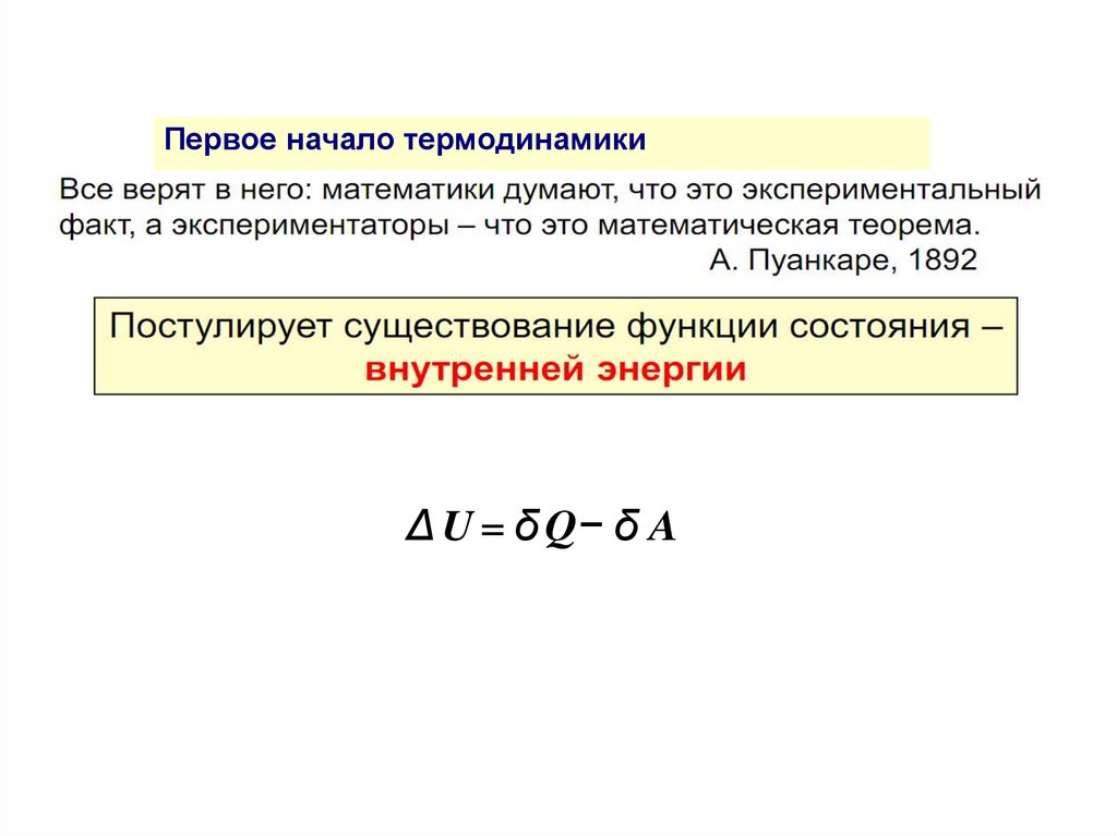 Первое начало термодинамикиΔ U = δ Q− δ A