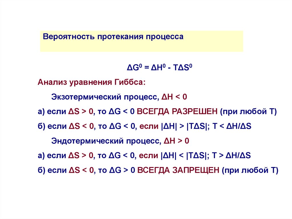 Вероятность протекания процессаΔG0 = ΔH0 - TΔS0