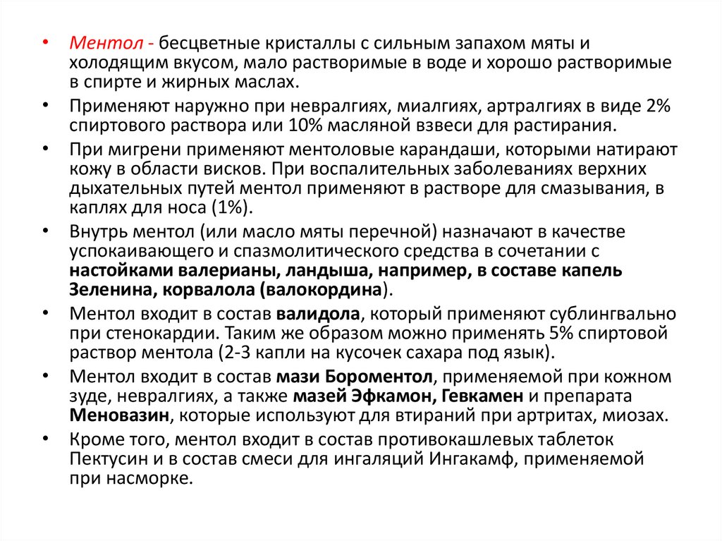 • Кроме того, ментол входит в состав противокашлевых таблеток