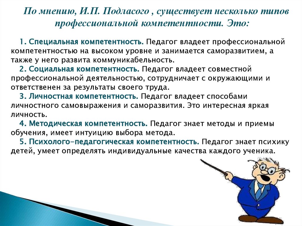 По мнению, И.П. Подласого , существует несколько типовпрофессиональной компетентности. Это: