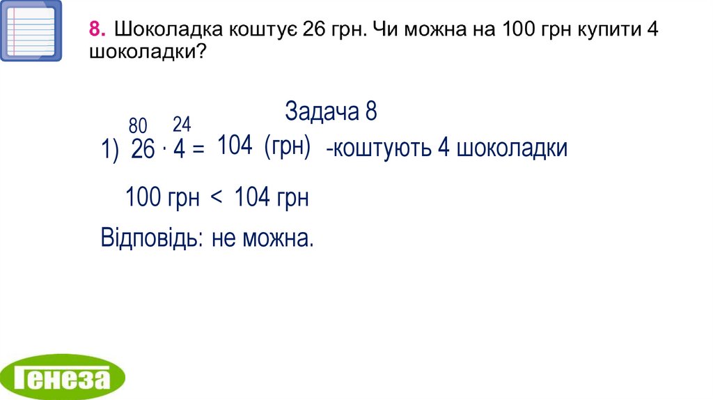 1) 26 ∙ 4 = 104 (грн) -коштують 4 шоколадки