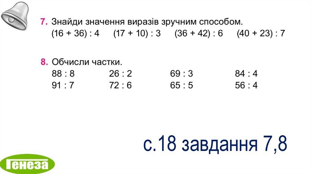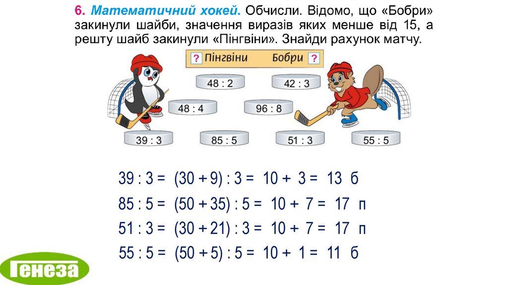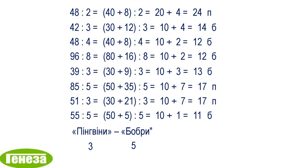 39 : 3 = (30 + 9) : 3 = 10 + 3 = 13 б85 : 5 = (50 + 35) : 5 = 10 + 7 = 17 п
