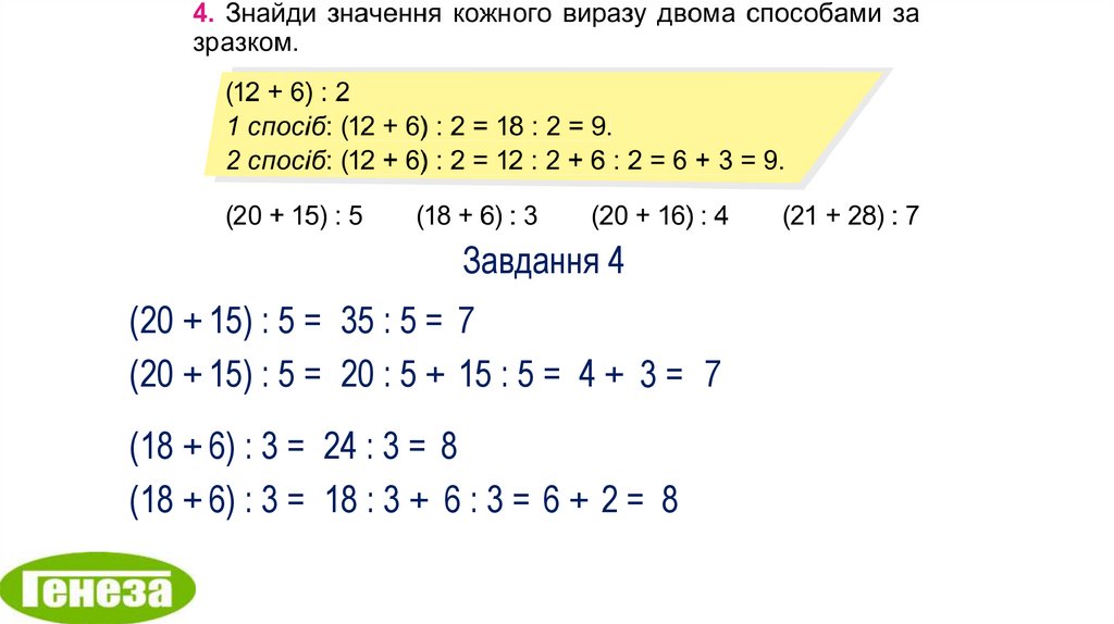 Завдання 4(20 + 15) : 5 = 35 : 5 = 7