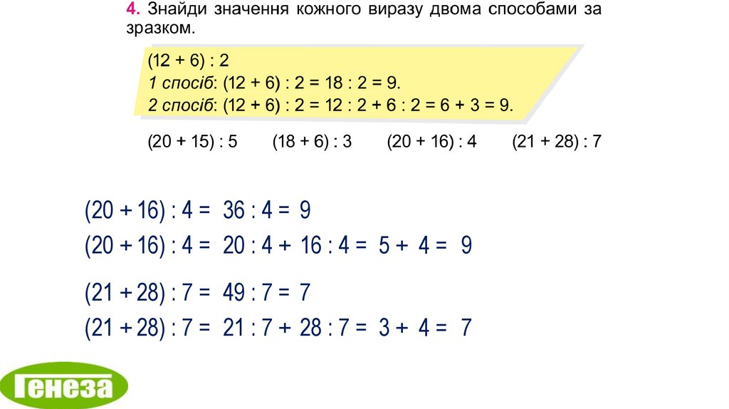 (20 + 16) : 4 = 36 : 4 = 9(20 + 16) : 4 = 20 : 4 + 16 : 4 = 5 + 4 = 9