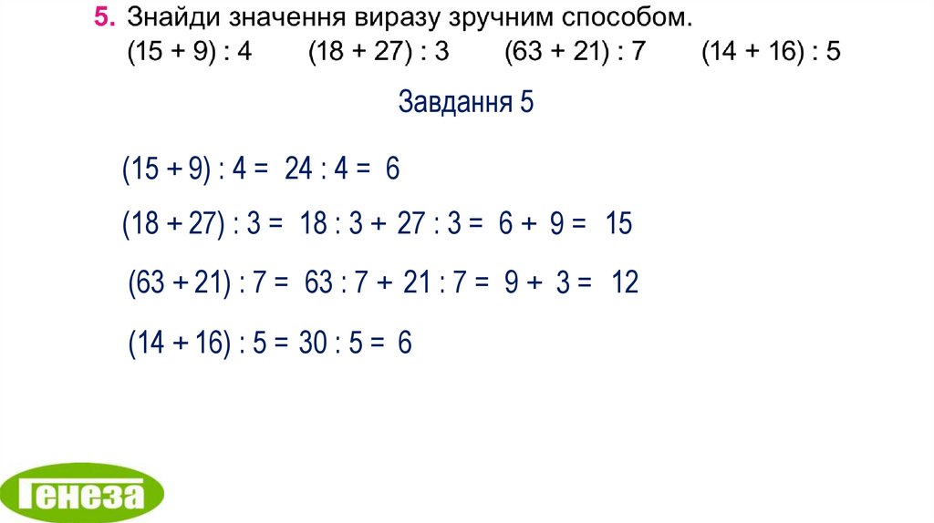Завдання 5(15 + 9) : 4 = 24 : 4 = 6
