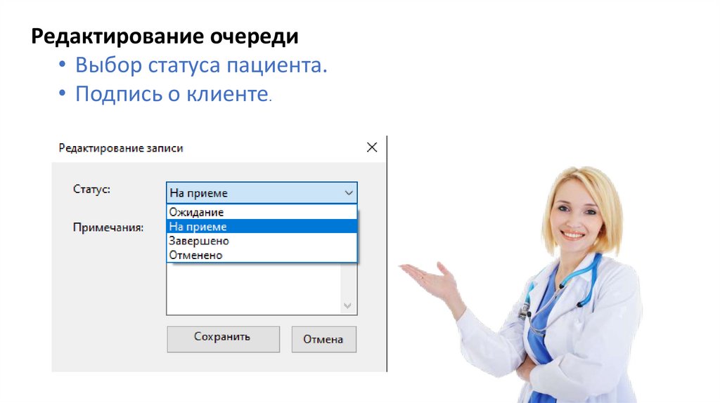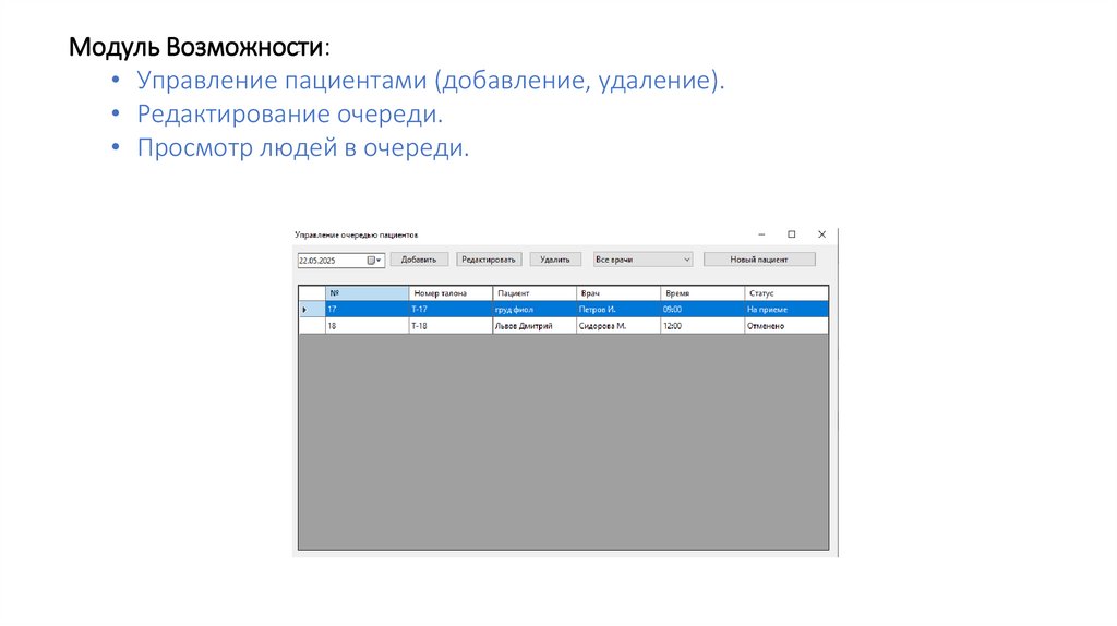 Модуль Возможности:• Управление пациентами (добавление, удаление).