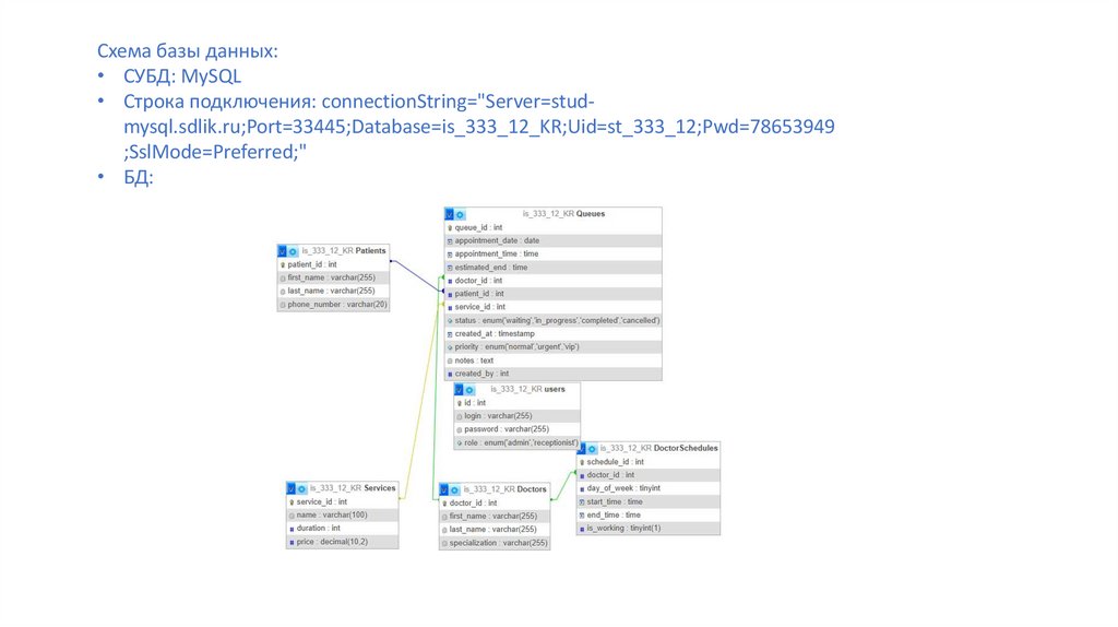 • Строка подключения: connectionString="Server=studmysql.sdlik.ru;Port=33445;Database=is_333_12_KR;Uid=st_333_12;Pwd=78653949