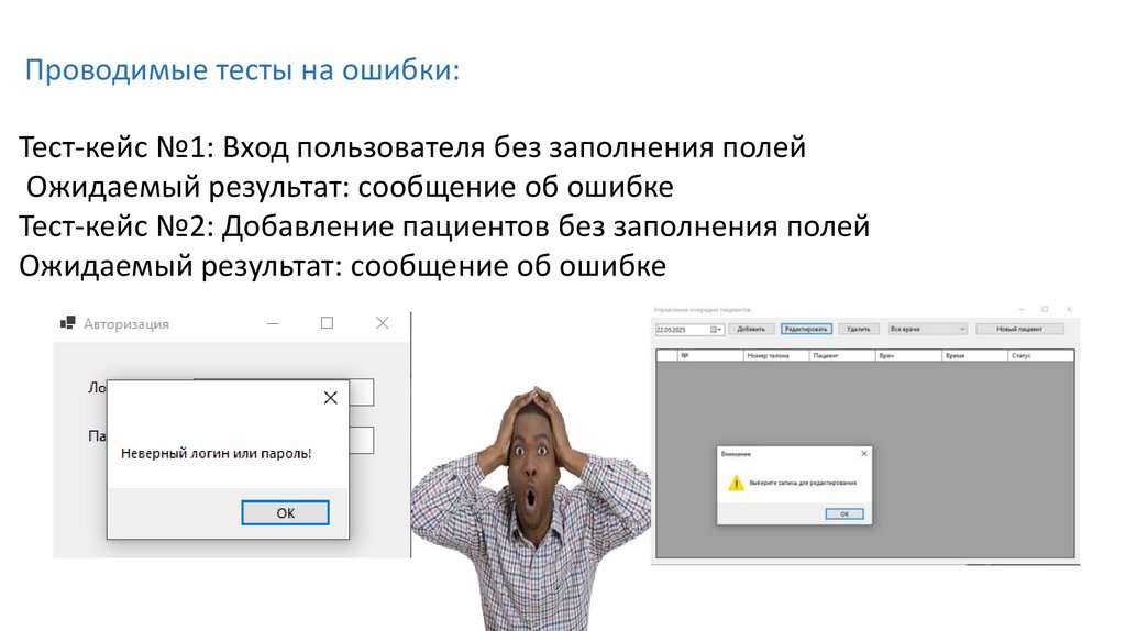 Проводимые тесты на ошибки:Тест-кейс №1: Вход пользователя без заполнения полей