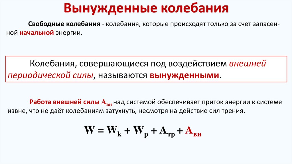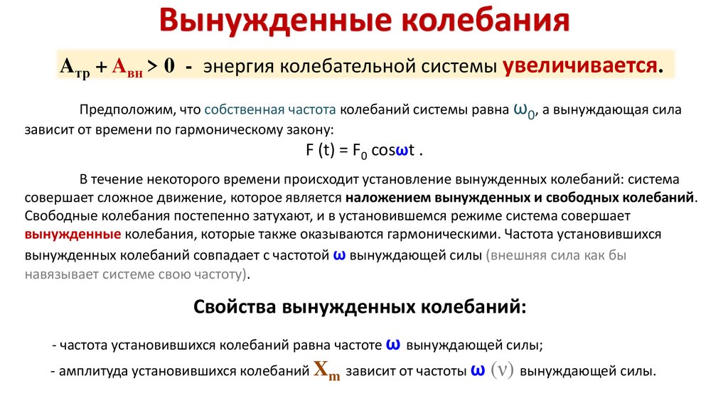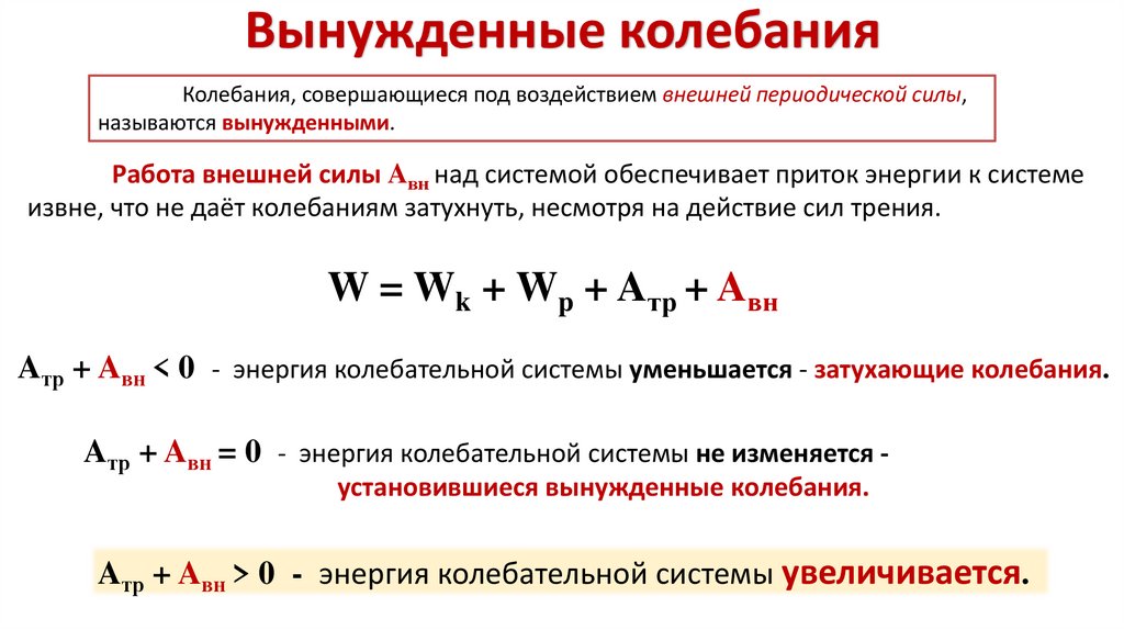 Вынужденные колебанияAтр + Aвн > 0 - энергия колебательной системы увеличивается.