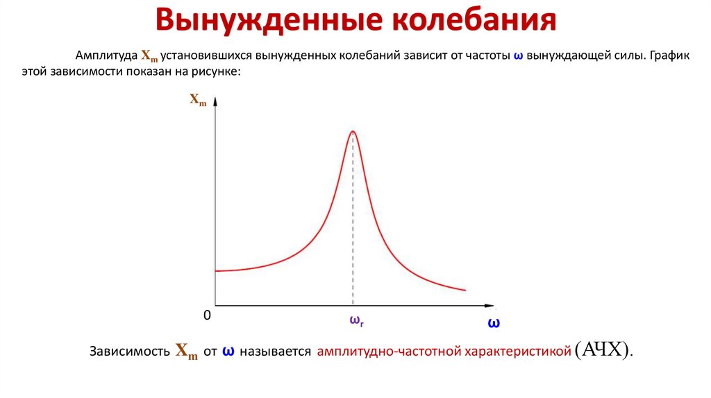 Вынужденные колебанияАмплитуда Xm установившихся вынужденных колебаний зависит от частоты ω вынуждающей силы. График