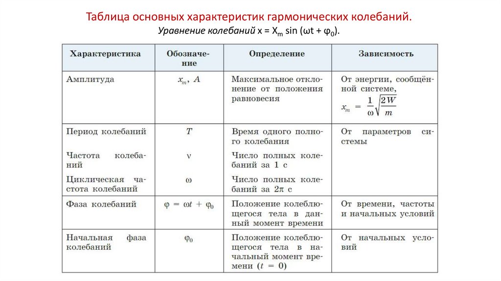 Таблица основных характеристик гармонических колебаний.Уравнение колебаний х = Xm sin (ωt + ϕ0).