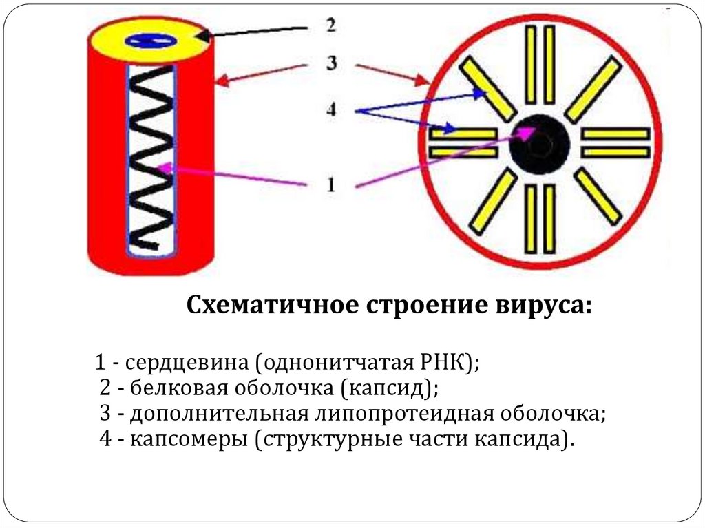Схематичное строение вируса:1 - сердцевина (однонитчатая РНК);