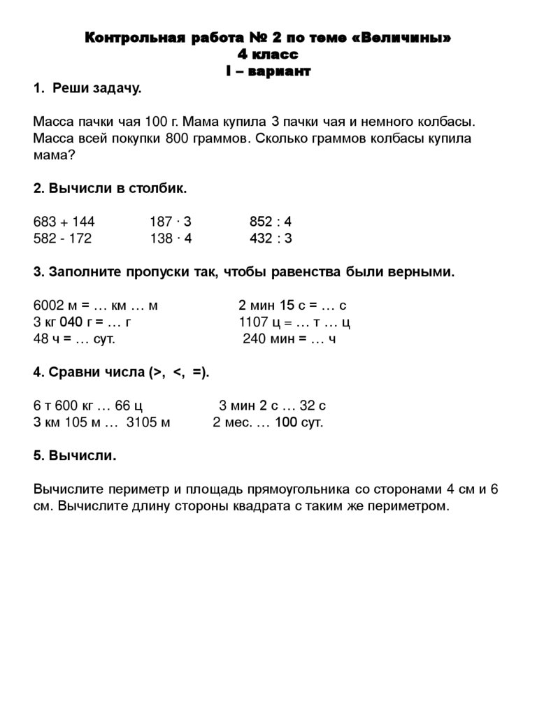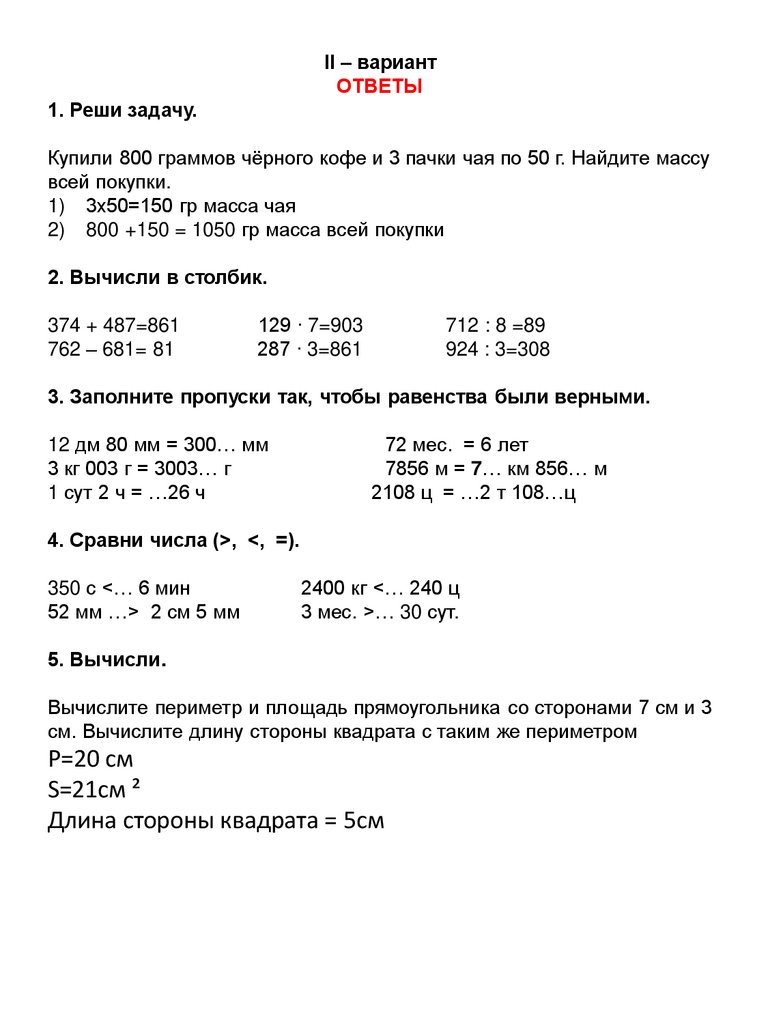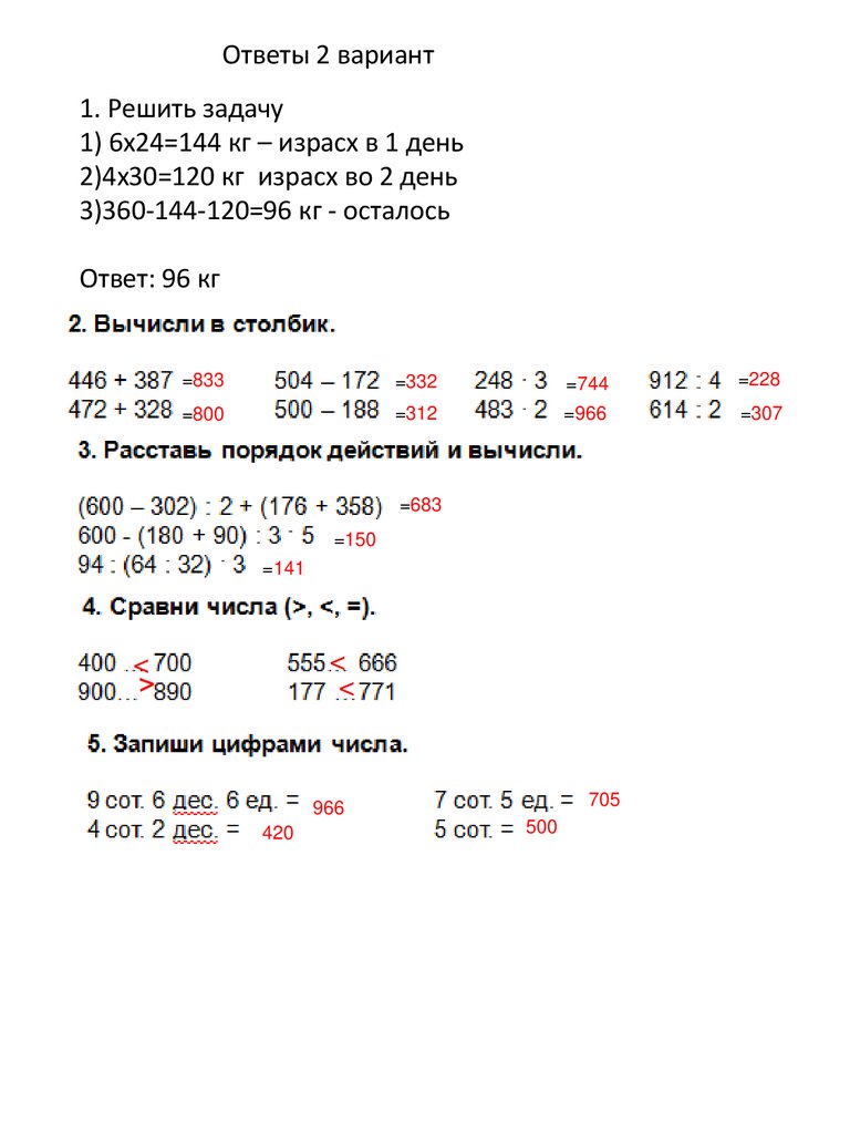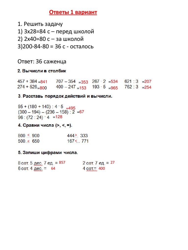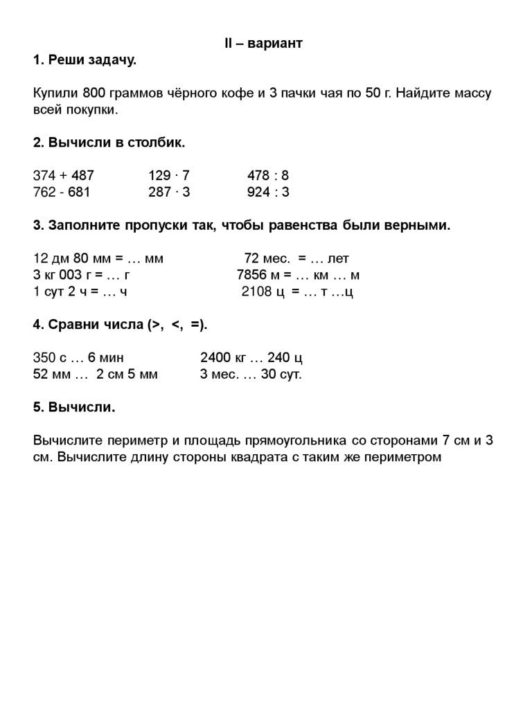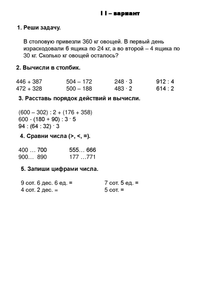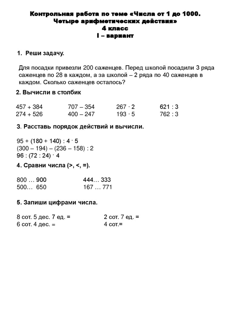 Контрольная работа по теме «Числа от 1 до 1000.Четыре арифметических действия»