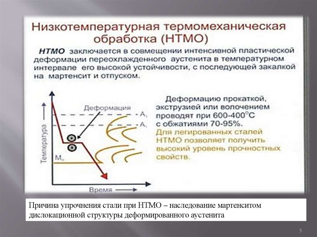 Включает в себя пластическую деформацию, которая влияет на формированиеструктуры во время термического воздействия на металл. После ТМО в сплаве