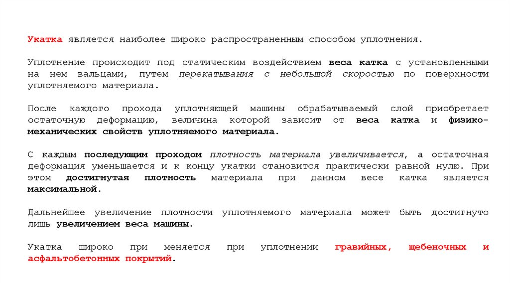 Укатка является наиболее широко распространенным способом уплотнения.Уплотнение происходит под статическим воздействием веса катка с установленными