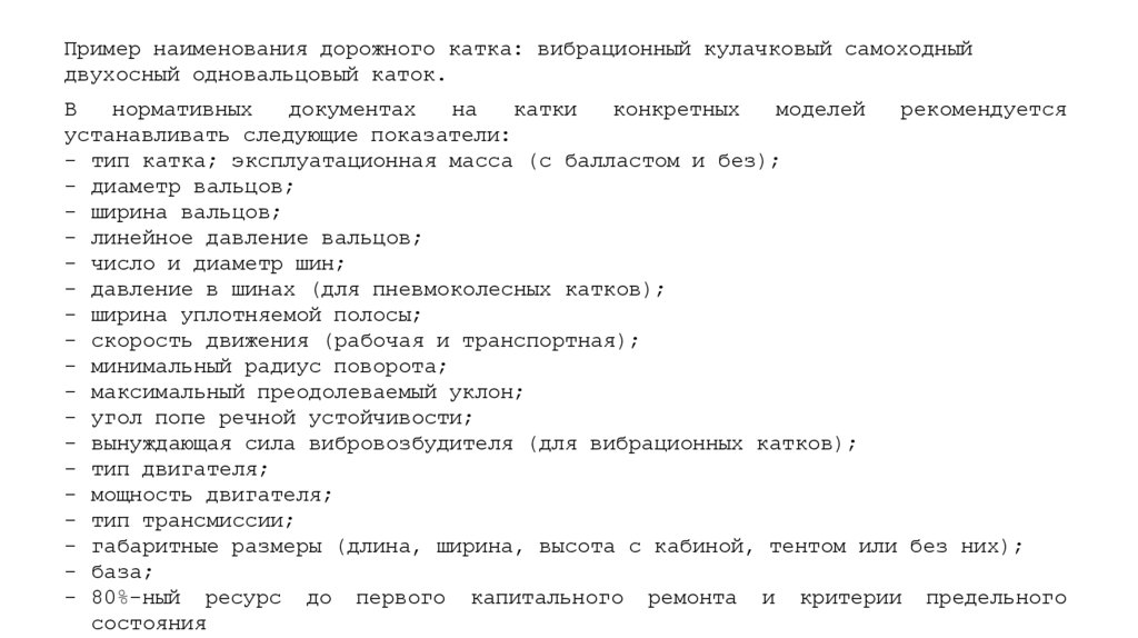 Пример наименования дорожного катка: вибрационный кулачковый самоходныйдвухосный одновальцовый каток.
