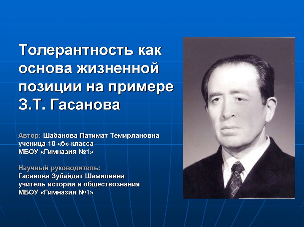1. Толерантность как основа жизненной позиции на примере З.Т. Гасанова Автор: Шабанова Патимат Темирлановна ученица 10 «б» класса