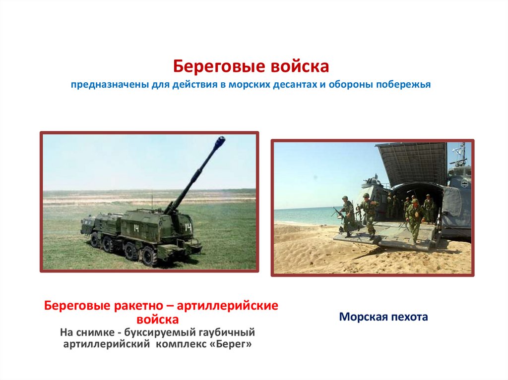 Береговые войскапредназначены для действия в морских десантах и обороны побережья