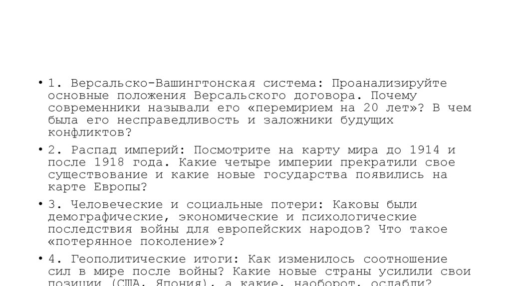• 1. Версальско-Вашингтонская система: Проанализируйтеосновные положения Версальского договора. Почему