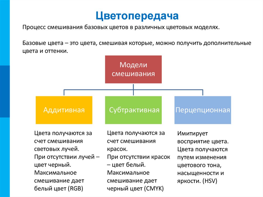 Процесс смешивания базовых цветов в различных цветовых моделях.
