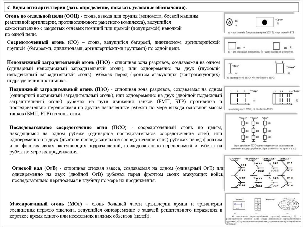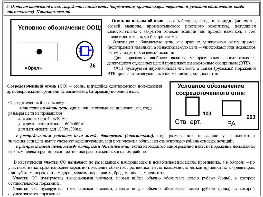 4. Виды огня артиллерии (дать определение, показать условные обозначения).Огонь по отдельной цели (ООЦ) - огонь, взвода или орудия (миномета, боевой машины