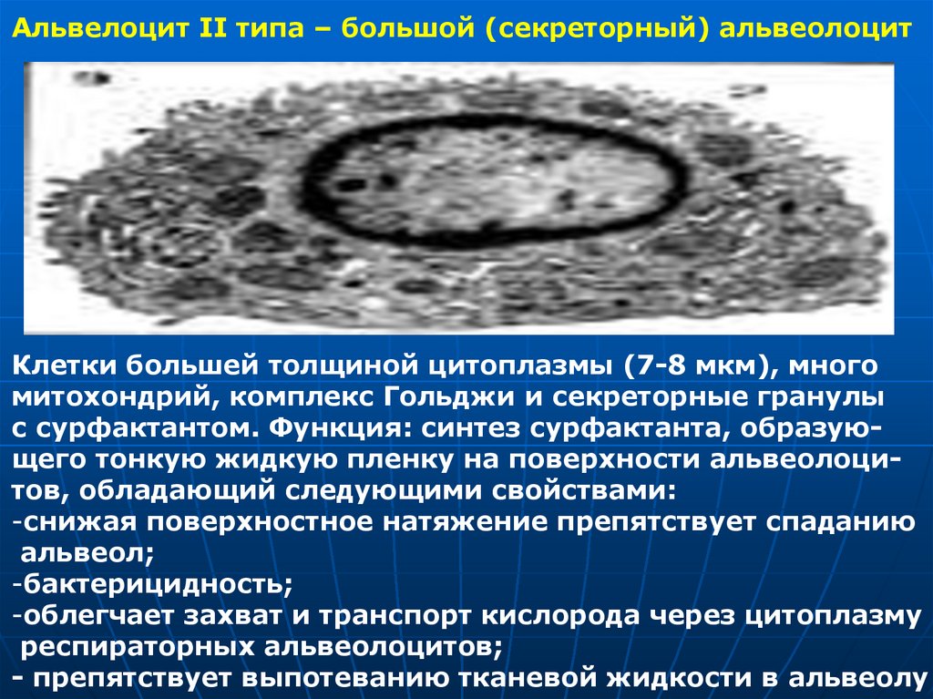Альвелоцит II типа – большой (секреторный) альвеолоцитКлетки большей толщиной цитоплазмы (7-8 мкм), много