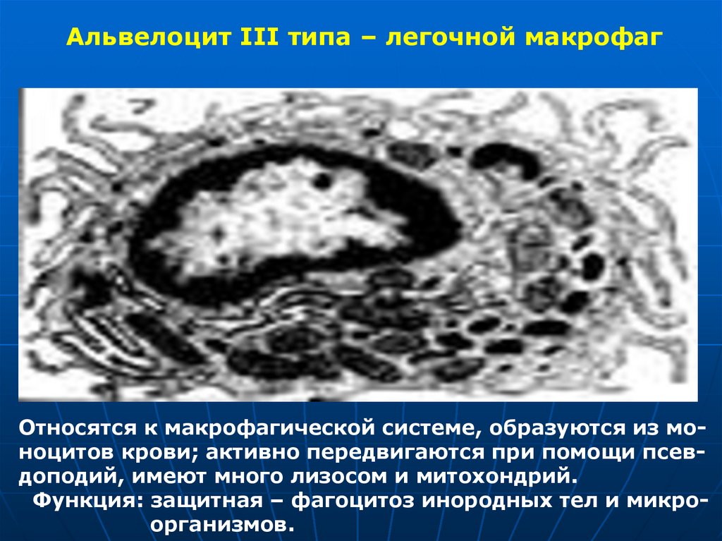 Альвелоцит III типа – легочной макрофагОтносятся к макрофагической системе, образуются из моноцитов крови; активно передвигаются при помощи псевдоподий, имеют много лизосом и митохондрий.