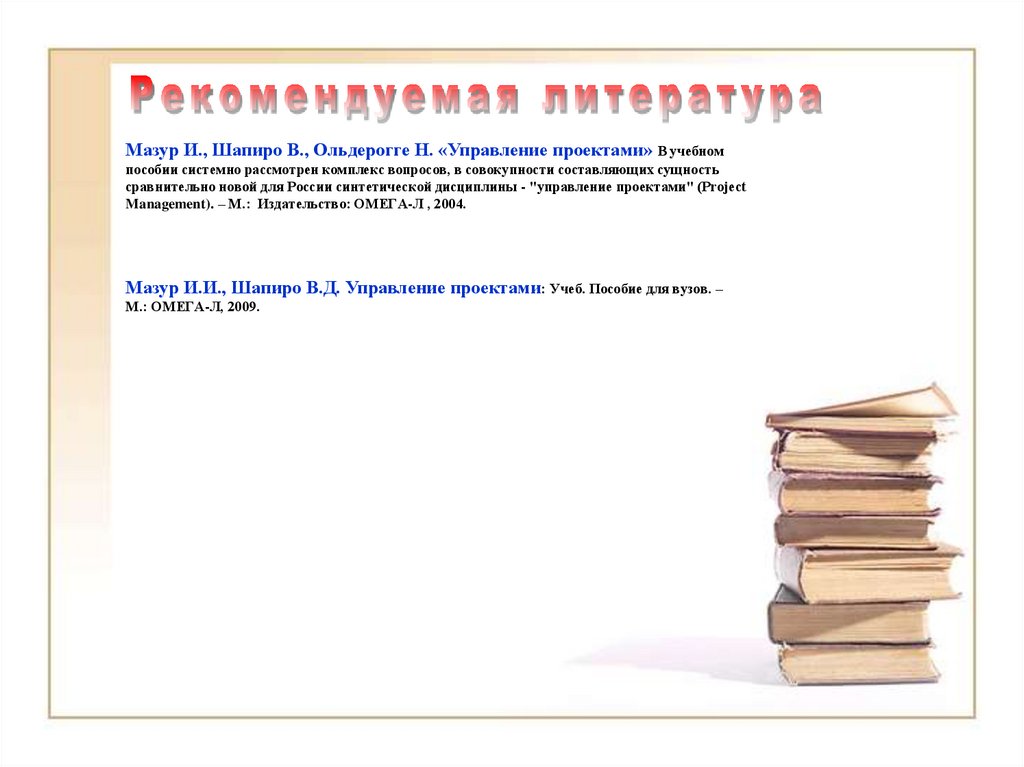 Мазур И., Шапиро В., Ольдерогге Н. «Управление проектами» В учебномпособии системно рассмотрен комплекс вопросов, в совокупности составляющих сущность