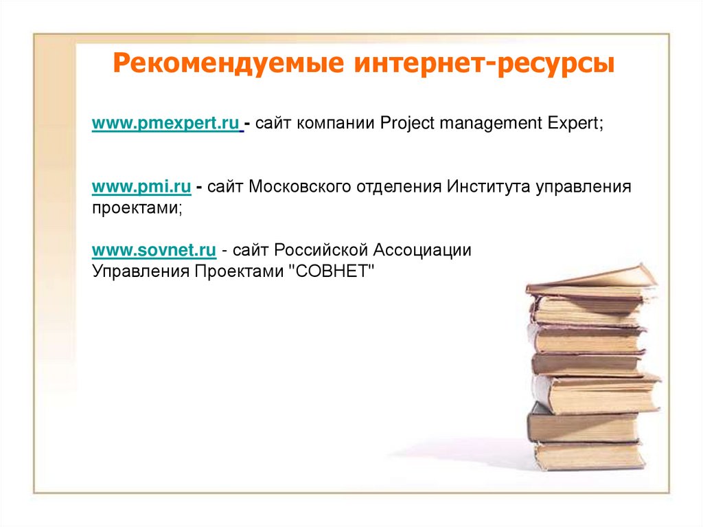 Рекомендуемые интернет-ресурсыwww.pmexpert.ru - сайт компании Project management Expert;