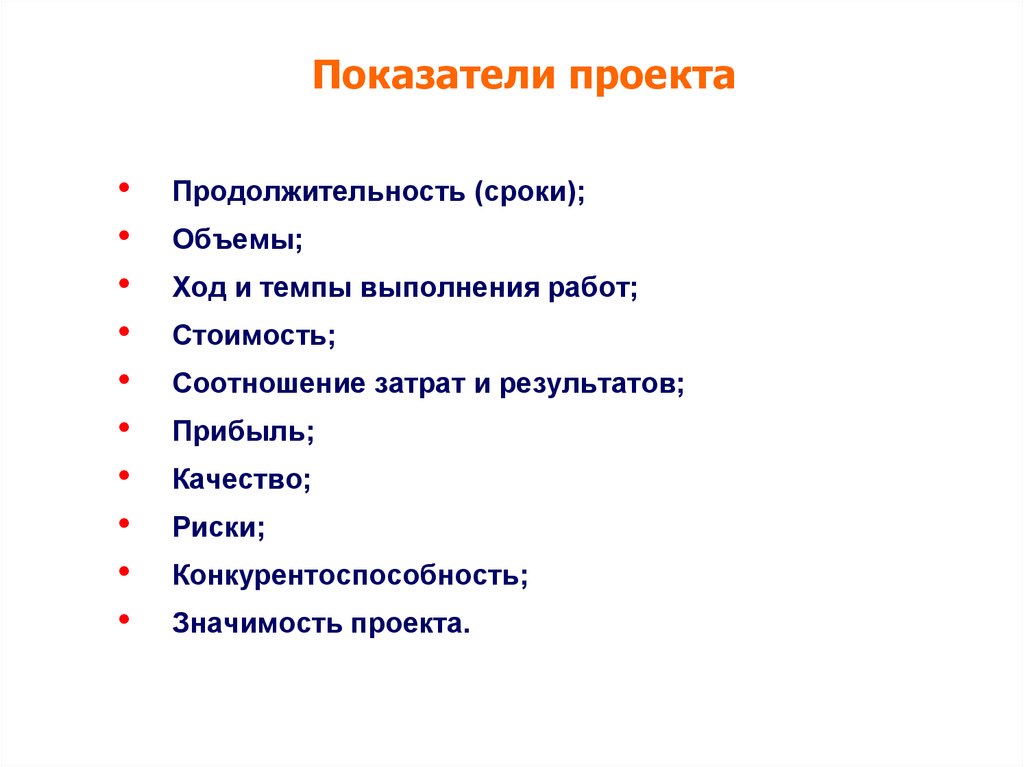 Показатели проектаПродолжительность (сроки);