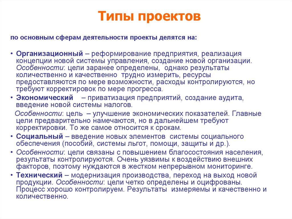 Типы проектовпо основным сферам деятельности проекты делятся на: