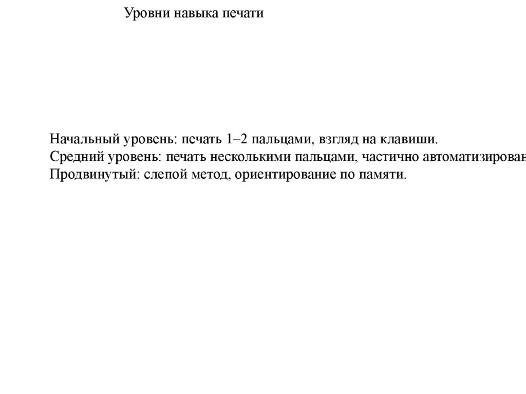 Уровни навыка печатиНачальный уровень: печать 1–2 пальцами, взгляд на клавиши.