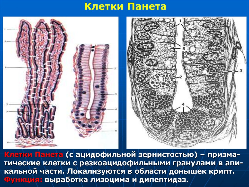 Клетки ПанетаКлетки Панета (с ацидофильной зернистостью) – призматические клетки с резкоацидофильными гранулами в апикальной части. Локализуются в области донышек крипт.