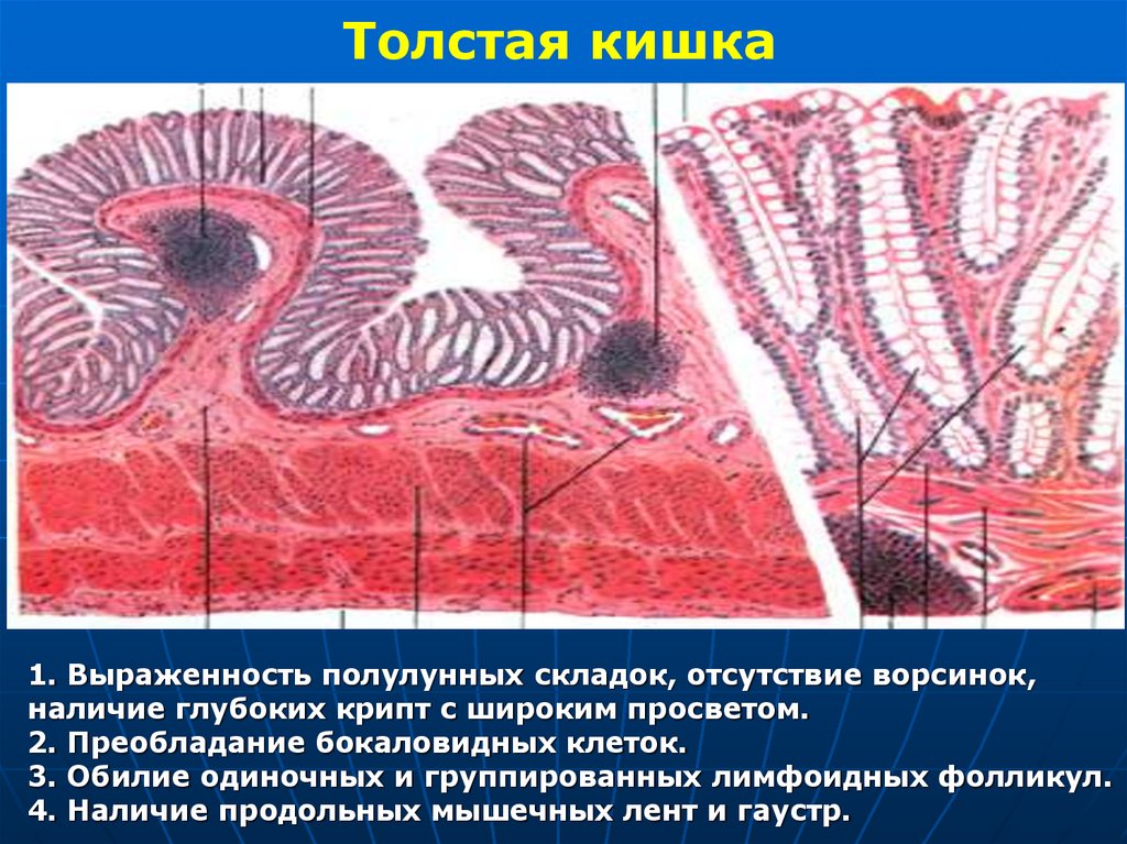 Толстая кишка1. Выраженность полулунных складок, отсутствие ворсинок,