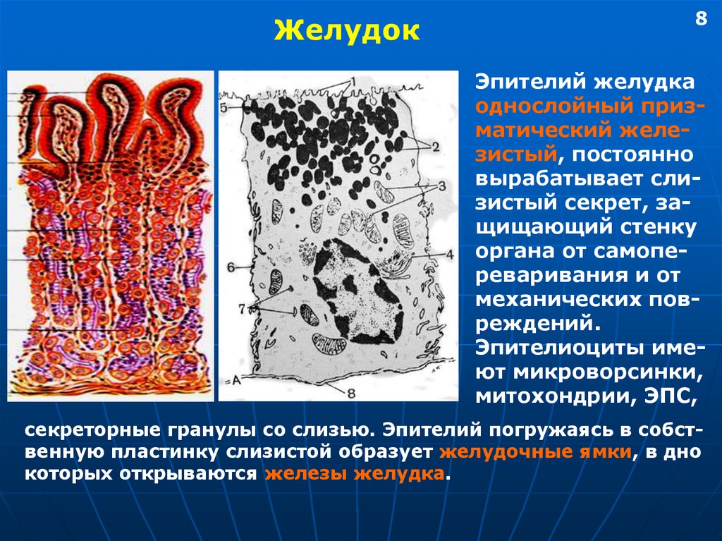 секреторные гранулы со слизью. Эпителий погружаясь в собственную пластинку слизистой образует желудочные ямки, в дно