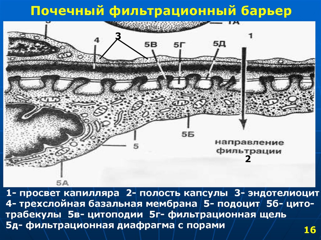 4- трехслойная базальная мембрана 5- подоцит 5б- цитотрабекулы 5в- цитоподии 5г- фильтрационная щель