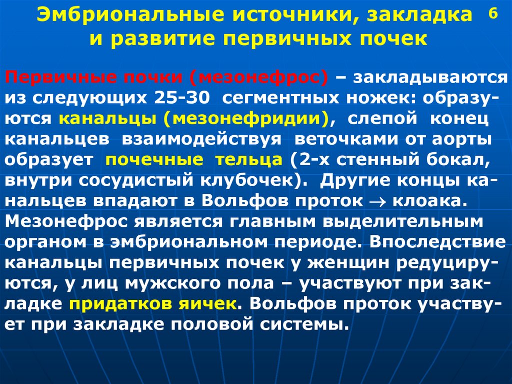 Эмбриональные источники, закладкаи развитие первичных почек