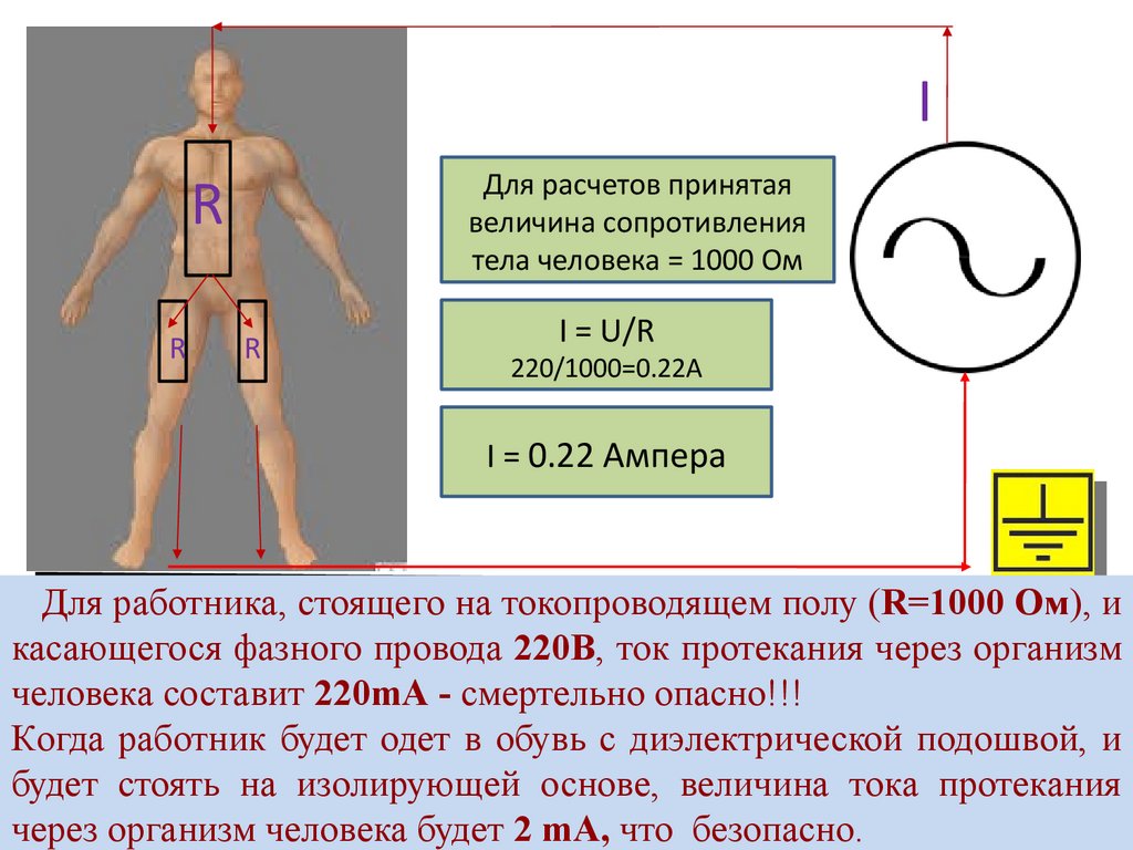 касающегося фазного провода 220В, ток протекания через организм